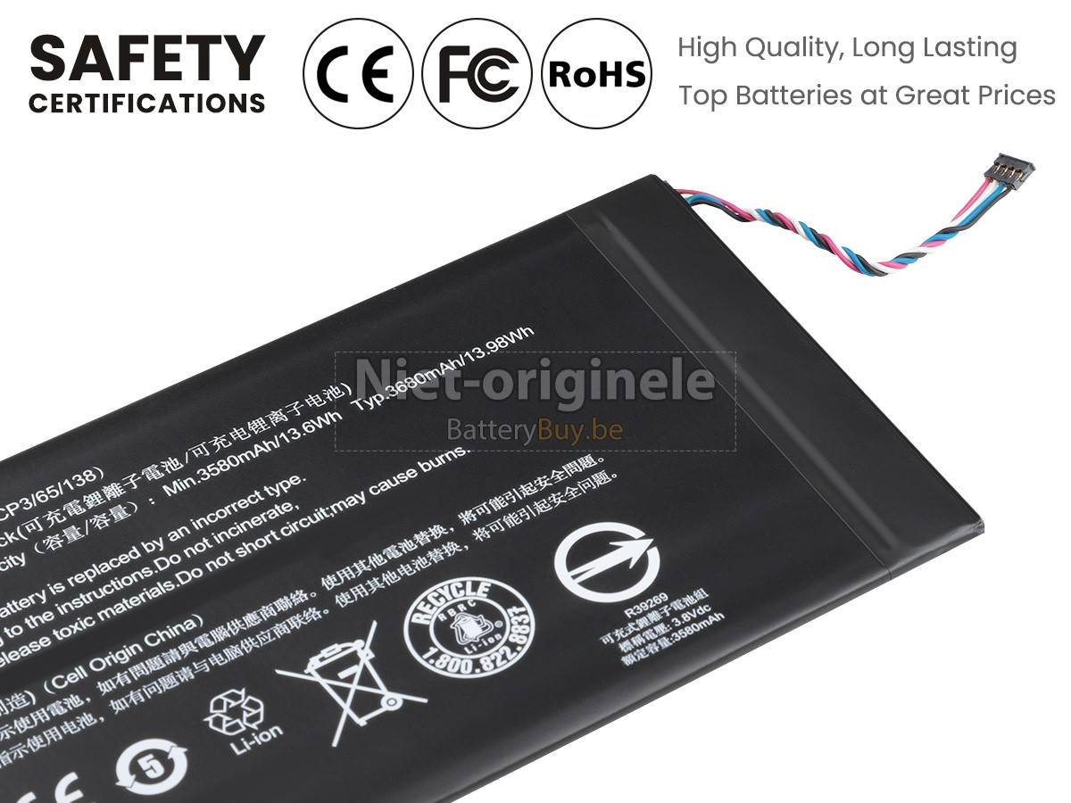 Alle batterijen die we aan de Acer Iconia One 7 B1-730 TabLET leverde hebben internationaal certificering genoemd (CE, UL, ROHS, ISO, 9001 / 9002).