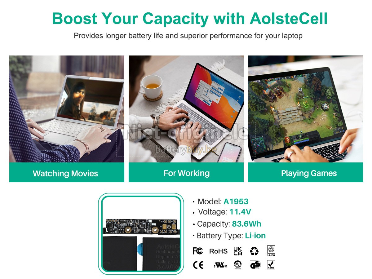 Al onze accu's zijn gloednieuw. We verkopen nooit accu dat oud, tweedehands of gerenoveerd is. We gebruiken allen de beste accucellen en componenten om uw zekerheid en ervaring te beschermen.Is er iets anders tussen jouw Apple 820-01095 accu en die van OEM?