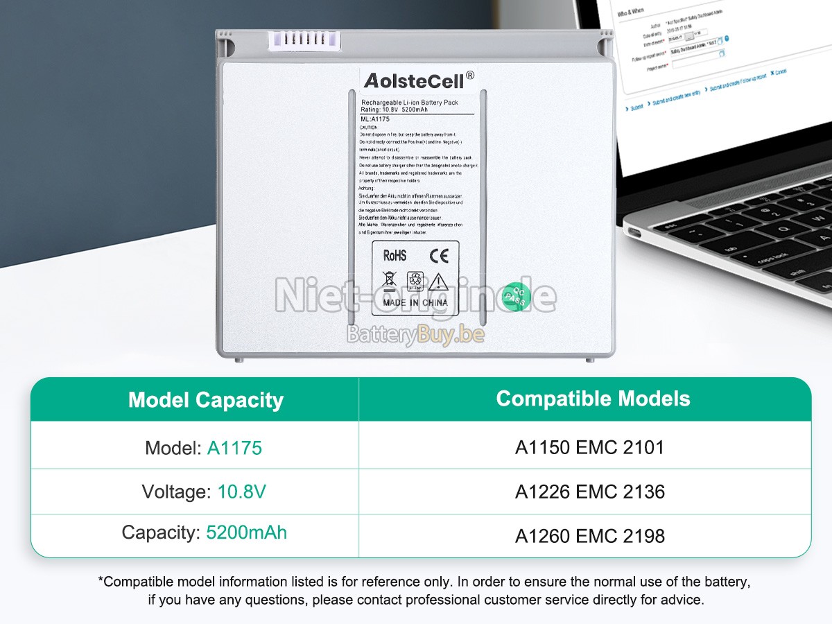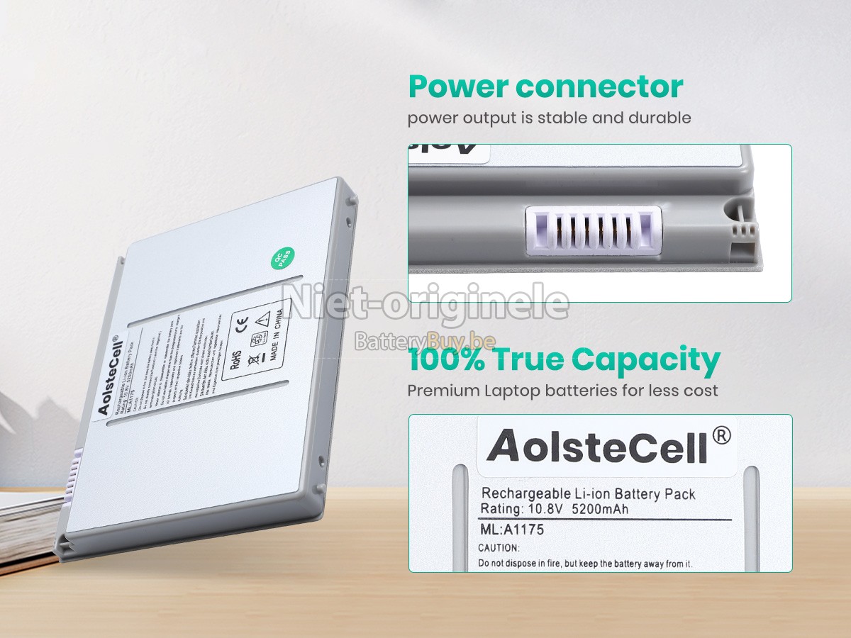 Waarom onze Apple A1175 accu kunnen maken uw apparaat langer werkt worden? We willen de beste wederverkoper van laptop accu's in België zijn, dus We bieden onze klanten alleen de laptop accu's van beste kwaliteit aan. Apple A1175 batterij maken gebruik van de superieur lithium-ion-accucellen van topbedrijven zoals Panasonic, Sony, Samsung en Texas Instruments. Dus de prestaties overeenstemmen of even overtreffen met die van originele accu's. Maar de prijs is zeer lager dan die van de originele accu's, want we vervaardigen onze eigen huls en de kosten van de waarde aan het merk verminderen, wat de extra kosten van onze klanten verlaagt.
