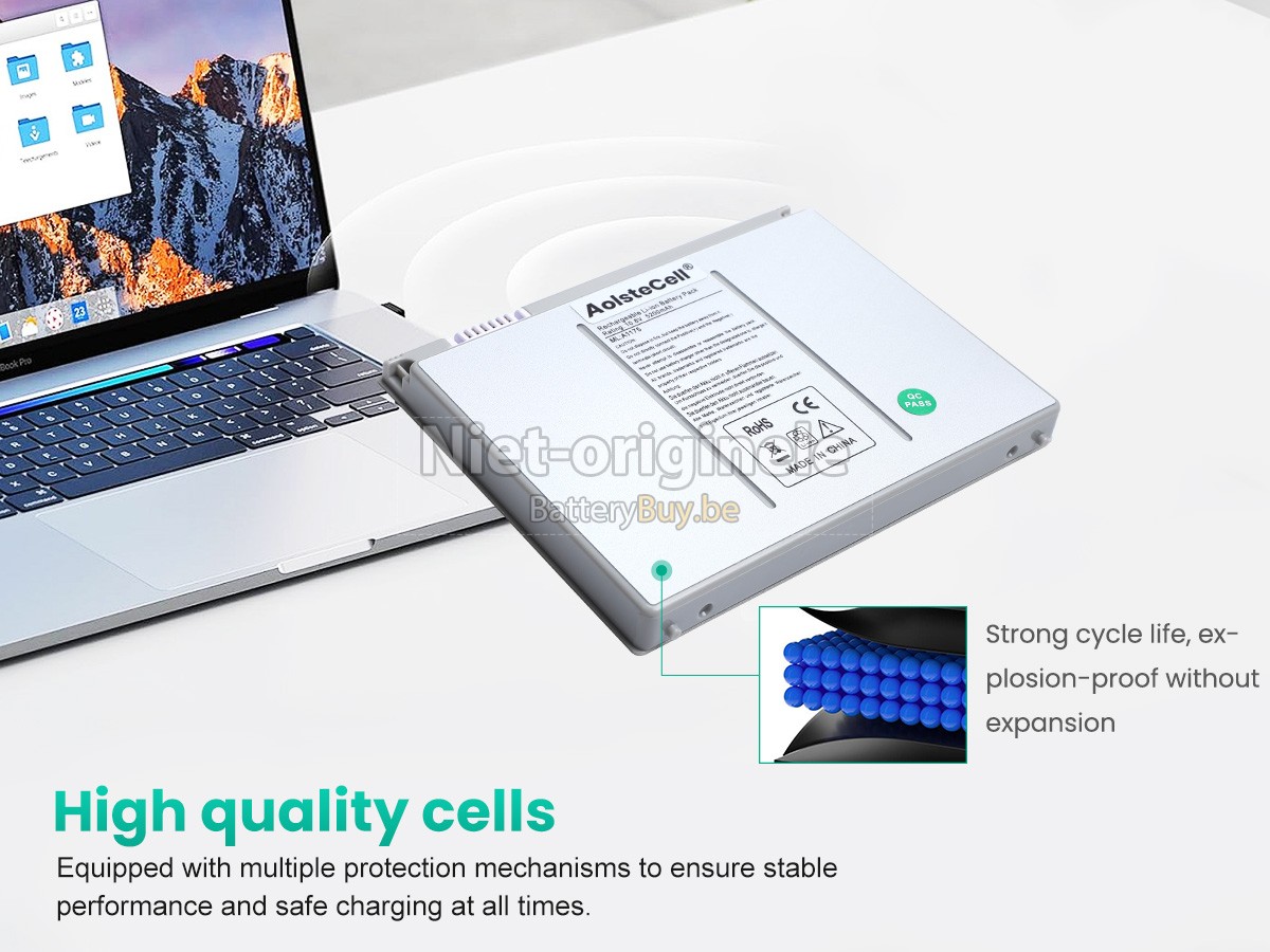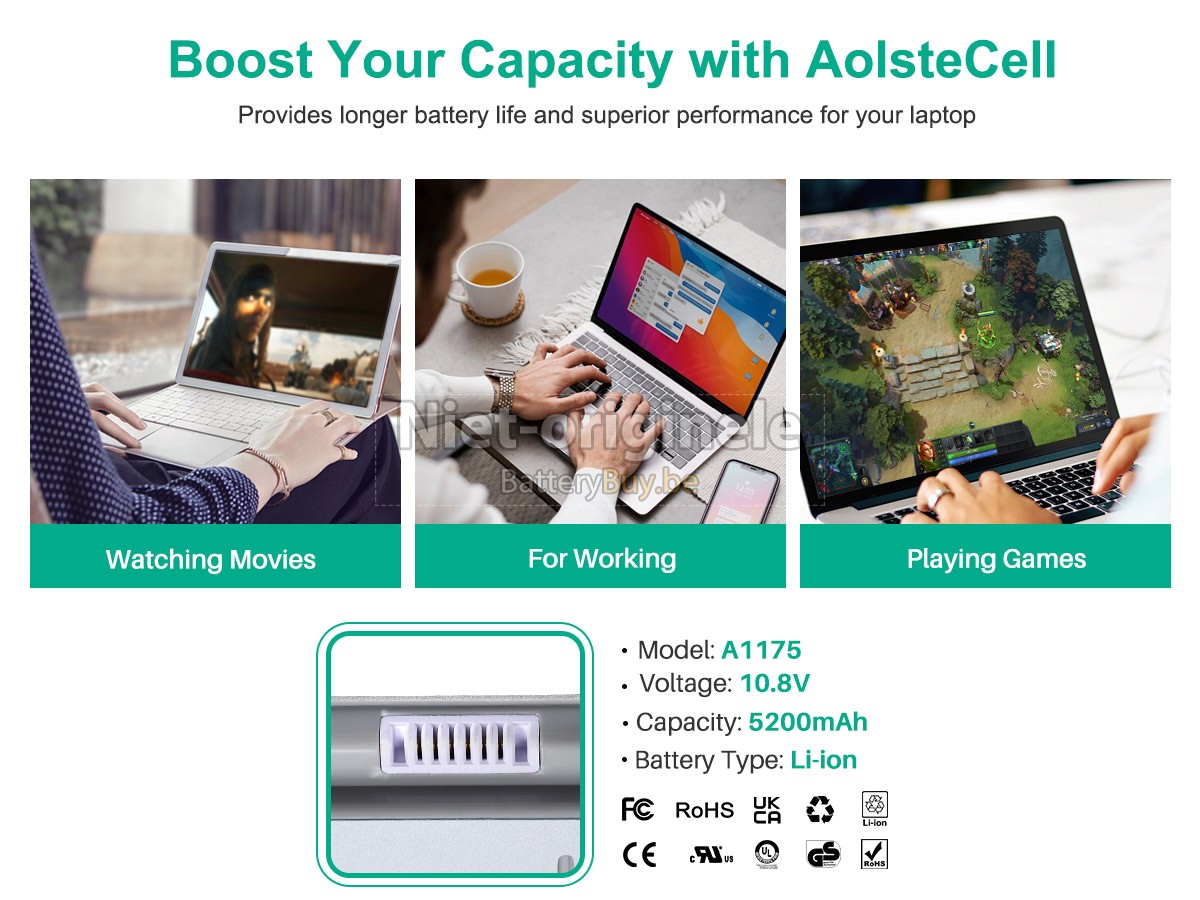 Al onze accu's zijn gloednieuw. We verkopen nooit accu dat oud, tweedehands of gerenoveerd is. We gebruiken allen de beste accucellen en componenten om uw zekerheid en ervaring te beschermen.Is er iets anders tussen jouw Apple A1175 accu en die van OEM?