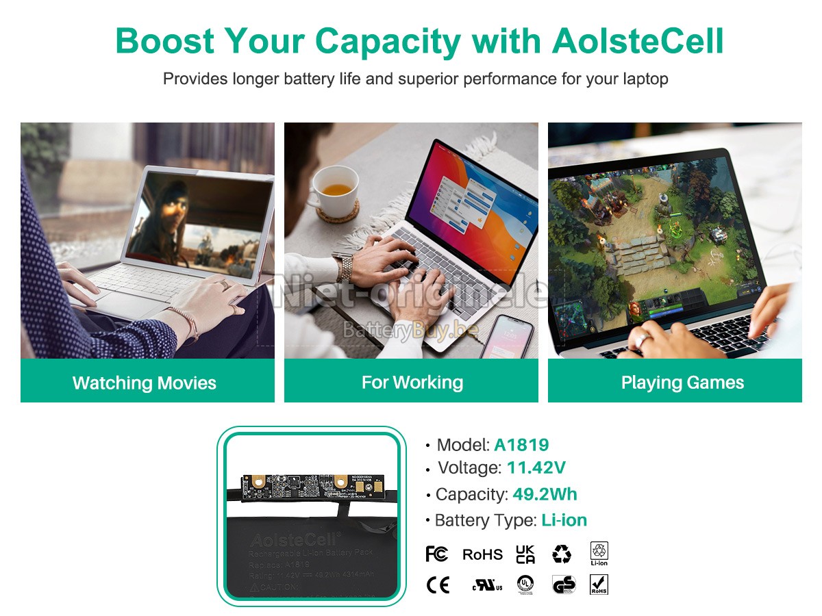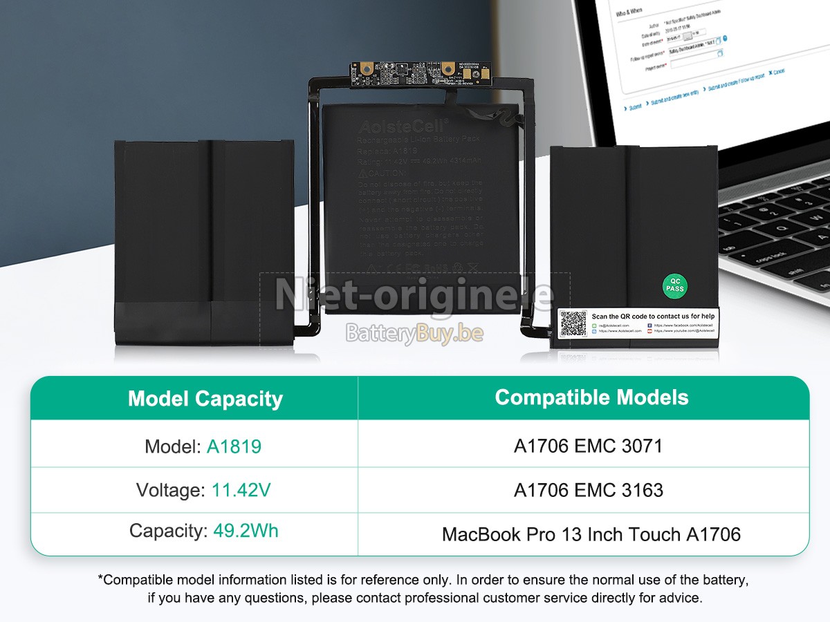 Al onze accu's zijn gloednieuw. We verkopen nooit accu dat oud, tweedehands of gerenoveerd is. We gebruiken allen de beste accucellen en componenten om uw zekerheid en ervaring te beschermen.Is er iets anders tussen jouw Apple MacBook Pro Core I5 3.1 13 inch TOUCH A1706(Late 2016) accu en die van OEM?