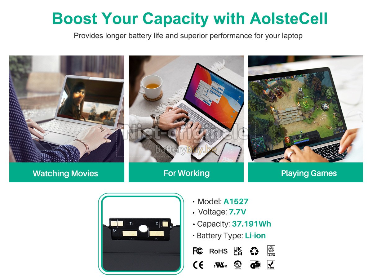 Niets, behalve dat onze Apple MLHF2LL/A batterij geen merk of label heeft. Consumenten achten de oorspronkelijke laptop accu van Apple, Dell, Toshiba en Hewlett-Packard vaak als de voordelen van een merknaam. Eigenlijk gebruiken ze ook de componenten van een derde partij. We maken onze accu’s eveneens met dezelfde accucellen en printplaat, maar we vervaardigen onze eigen huls en de kosten van de waarde aan het merk verlagen. Daarom consumenten laptop accu van wereldniveau die dezelfde met originele versie is kunnen kopen tegen een veel lage prijs.Kan mijn Apple MLHF2LL/A laptop accu verschillende capaciteiten gebruiken?