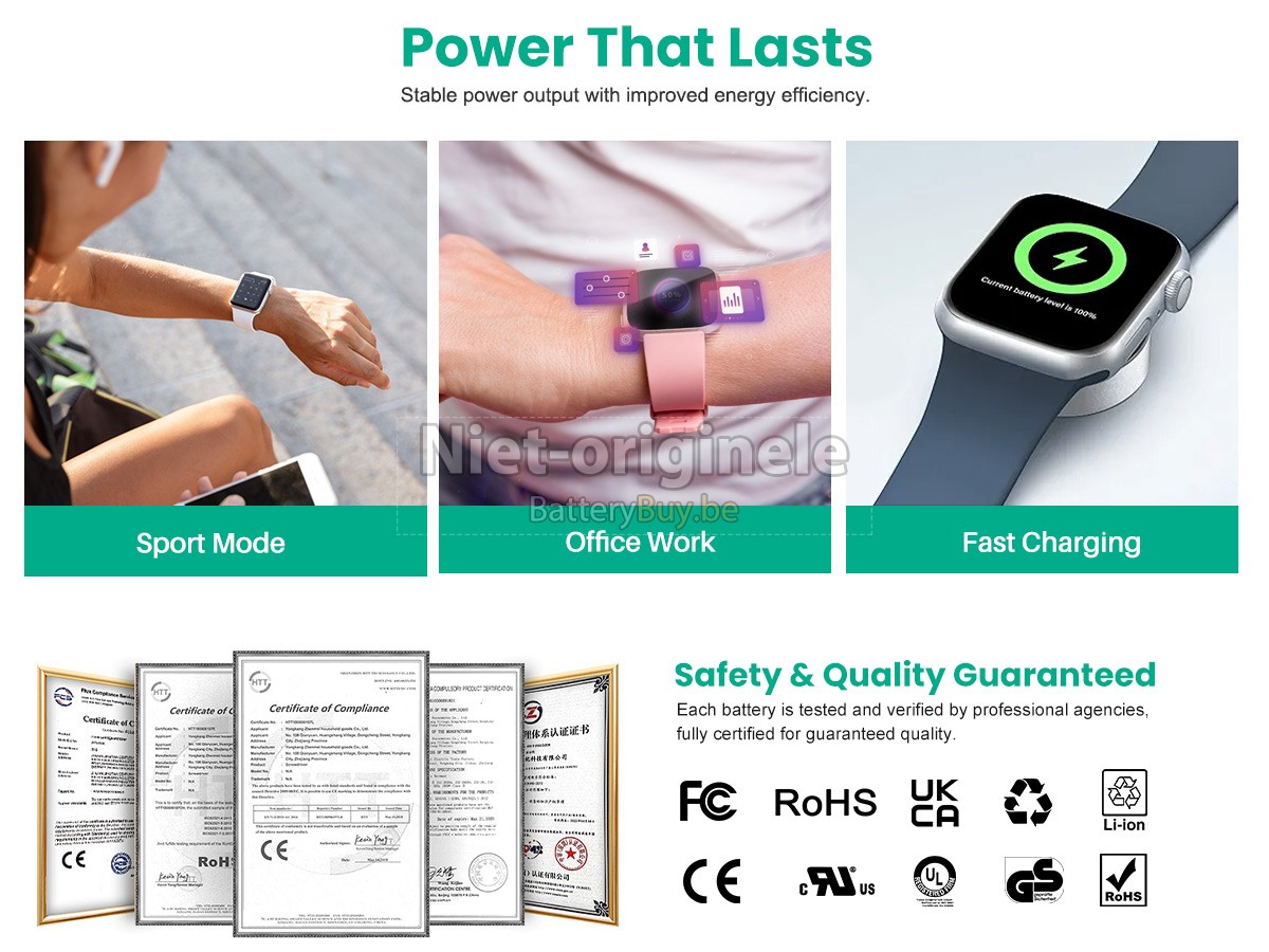 Waarom onze Apple WATCH Series 7 GPS 45MM accu kunnen maken uw apparaat langer werkt worden? We willen de beste wederverkoper van smartwatch accu's in België zijn, dus We bieden onze klanten alleen de smartwatch accu's van beste kwaliteit aan. Apple WATCH Series 7 GPS 45MM batterij maken gebruik van de superieur lithium-ion-accucellen van topbedrijven zoals Panasonic, Sony, Samsung en Texas Instruments. Dus de prestaties overeenstemmen of even overtreffen met die van originele accu's. Maar de prijs is zeer lager dan die van de originele accu's, want we vervaardigen onze eigen huls en de kosten van de waarde aan het merk verminderen, wat de extra kosten van onze klanten verlaagt.