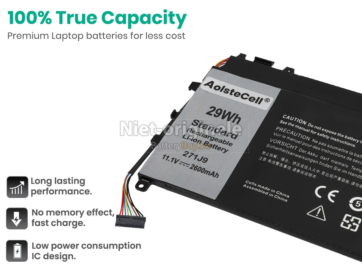 Waarom onze Dell 271J9 accu kunnen maken uw apparaat langer werkt worden? We willen de beste wederverkoper van laptop accu's in België zijn, dus We bieden onze klanten alleen de laptop accu's van beste kwaliteit aan. Dell 271J9 batterij maken gebruik van de superieur lithium-ion-accucellen van topbedrijven zoals Panasonic, Sony, Samsung en Texas Instruments. Dus de prestaties overeenstemmen of even overtreffen met die van originele accu's. Maar de prijs is zeer lager dan die van de originele accu's, want we vervaardigen onze eigen huls en de kosten van de waarde aan het merk verminderen, wat de extra kosten van onze klanten verlaagt.