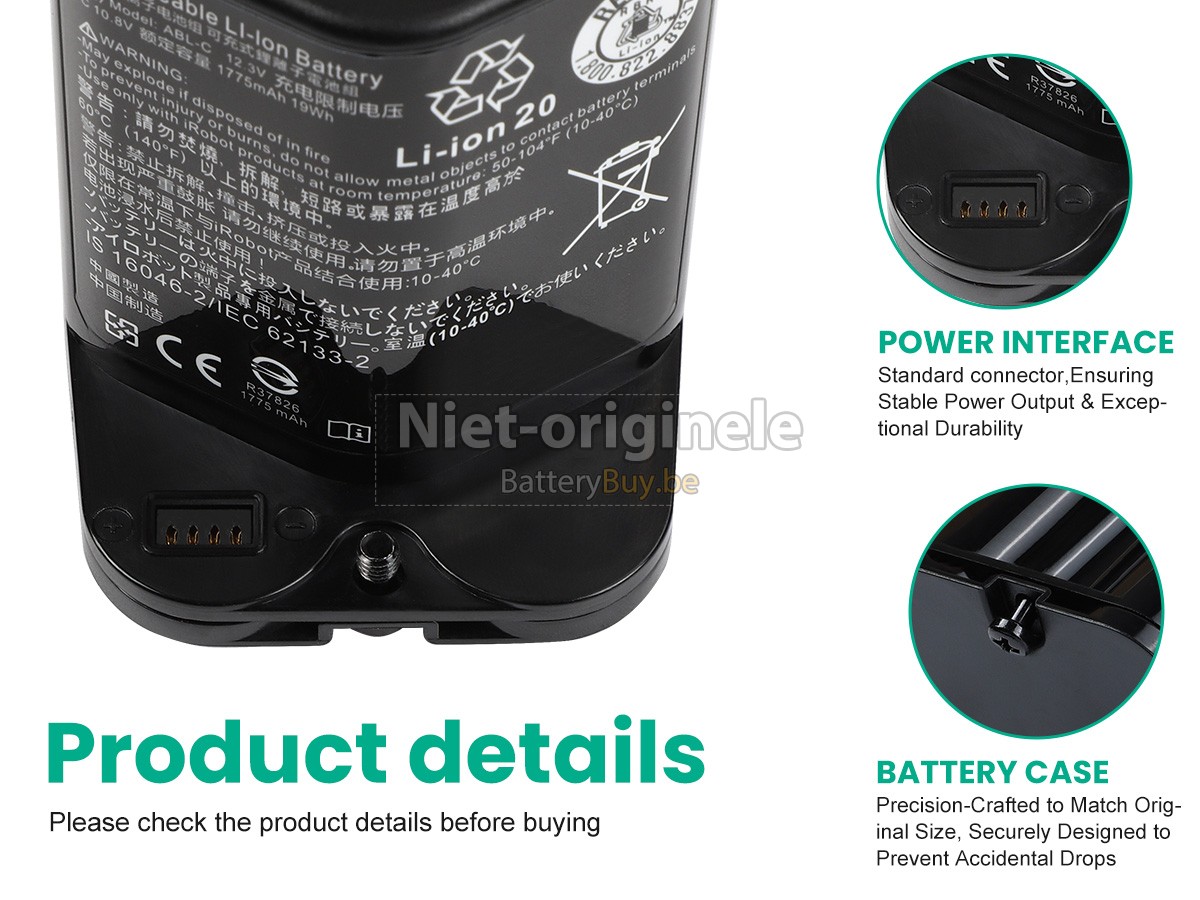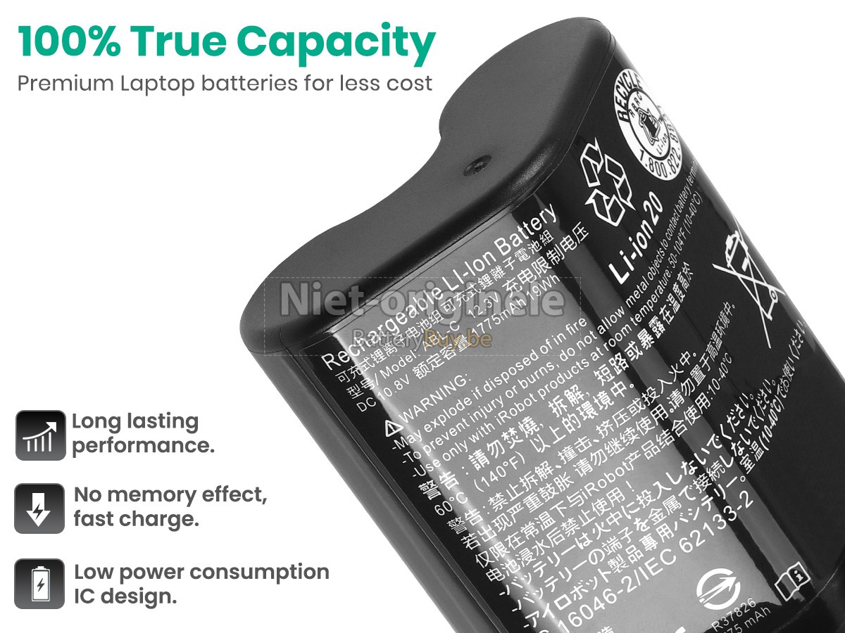 Waarom onze Irobot M6126 accu kunnen maken uw apparaat langer werkt worden? We willen de beste wederverkoper van stofzuiger accu's in België zijn, dus We bieden onze klanten alleen de stofzuiger accu's van beste kwaliteit aan. Irobot M6126 batterij maken gebruik van de superieur lithium-ion-accucellen van topbedrijven zoals Panasonic, Sony, Samsung en Texas Instruments. Dus de prestaties overeenstemmen of even overtreffen met die van originele accu's. Maar de prijs is zeer lager dan die van de originele accu's, want we vervaardigen onze eigen huls en de kosten van de waarde aan het merk verminderen, wat de extra kosten van onze klanten verlaagt.