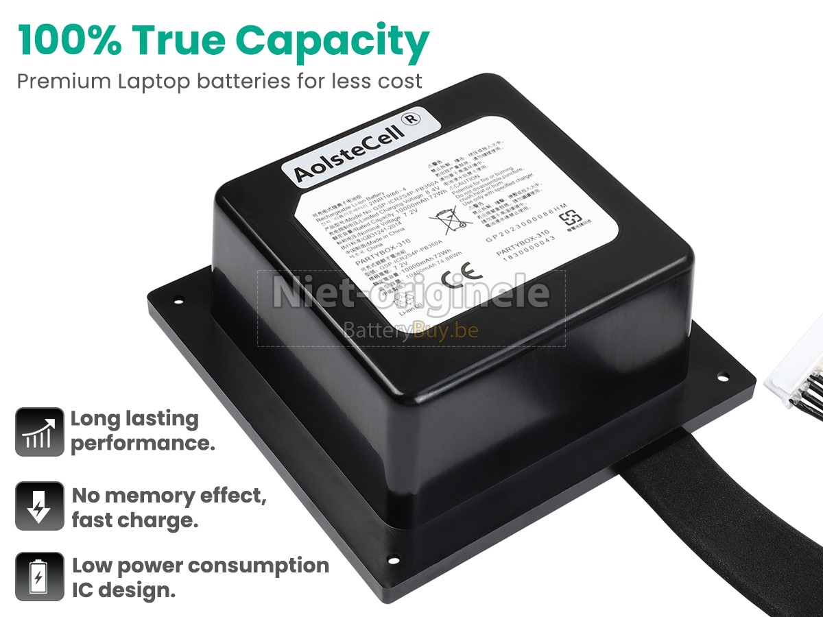 Waarom onze JBL GSP-2S4P-PB350D accu kunnen maken uw apparaat langer werkt worden? We willen de beste wederverkoper van speaker accu's in België zijn, dus We bieden onze klanten alleen de speaker accu's van beste kwaliteit aan. JBL GSP-2S4P-PB350D batterij maken gebruik van de superieur lithium-ion-accucellen van topbedrijven zoals Panasonic, Sony, Samsung en Texas Instruments. Dus de prestaties overeenstemmen of even overtreffen met die van originele accu's. Maar de prijs is zeer lager dan die van de originele accu's, want we vervaardigen onze eigen huls en de kosten van de waarde aan het merk verminderen, wat de extra kosten van onze klanten verlaagt.