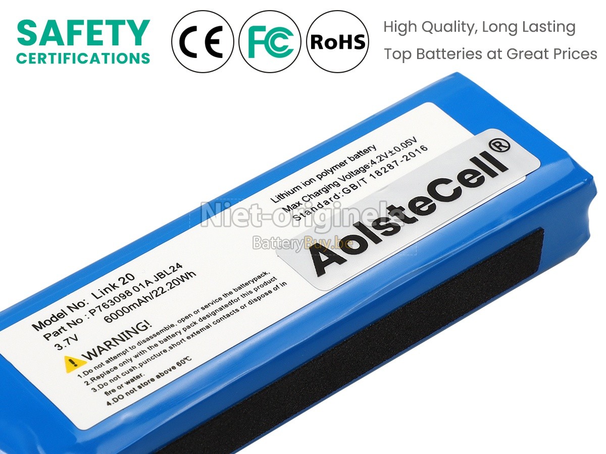 Alle batterijen die we aan de JBL P763098-01A leverde hebben internationaal certificering genoemd (CE, UL, ROHS, ISO, 9001 / 9002).