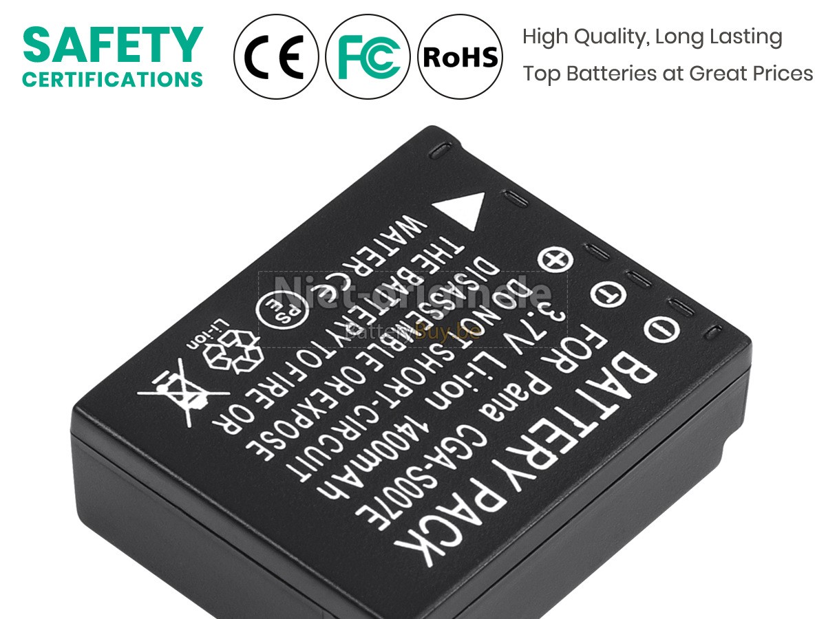 Alle batterijen die we aan de Panasonic CGA-S007E leverde hebben internationaal certificering genoemd (CE, UL, ROHS, ISO, 9001 / 9002).
